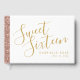 Personalized rose gold pink glitter stripe sweet 16 birthday party guest book with a fun, modern, and minimal typography. Shown with pink, white, and gold 16th Birthday wording, but every part can be changed, including the fonts, text colour, and book background colour.