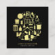 Modern trendy gold and black business card designed for a commercial or residential services for cleaning, housekeeper, maid service, or janitorial supplies. Design featuring of gold round icon and cleaning equipment icons inside it. Customize the front with two lines of custom text on a black background, and add your full contact details to the back and social media details. Trendy chic modern design.