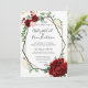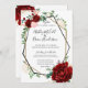 Modern Gold and Merlot Geometric Wedding Invite. These greenery foliage invites will do the trick! This customizable invite features a modern geometric frame with faux gold glitter and black. The borders are adorned with green foliage such as eucalyptus, berries and pink and merlot roses flowers. The sides are adorned with faux gold glitter. This makes a great modern foliage invite.
