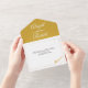 Modern gold and white typography and small flowers all in one fall wedding invitation. It displays your names in a cursive script elegant style typography and two small white flowers with leaves on both sides of the ampersand on gold. The RSVP can be detached.