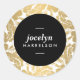 Coordinates with the Modern Gold Flowers Black Circle Business Card Template by 1201AM. A faux gold vintage floral pattern is made modern with a black circle logo highlighting your name or business name on these personalized stickers. Great to use for sealing envelopes, adding your brand onto packages, or personalizing office accessories. This product is part of a design suite of coordinating office supplies. © 1201AM CREATIVE
