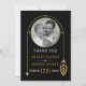 This stunning Thank You card is sure to leave a lasting impression on your guests. Featuring a beautiful gold frame resembling a piece of wire jewellery, the card displays an image of the happy couple against a dark backdrop. The frame is adorned with a delicate leaf detail on one side and an arrow on the other, adding a hint of sophistication to the design. On the back of the item there is a gold pattern featuring the couple's names diagonally across the black background.