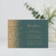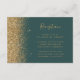 The left-hand edge of this elegant modern wedding reception enclosure card features a gold faux glitter design. The customizable text combines gold-coloured handwriting, copperplate and italic fonts on a dark green background. The reverse side features a matching green and gold glitter design.