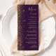 The left-hand edge of this elegant modern wedding menu features a gold faux glitter design. The customizable text combines gold-coloured handwriting, copperplate and italic fonts on a dark purple background. The reverse side features a matching purple and gold glitter design.