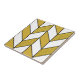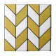 This modern ceramic tile features an elegant chevron design with a geometric herringbone pattern in white and faux gold glitter with black lines.