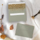 The inside of this elegant modern wedding invitation envelope features a gold faux glitter design on a sage green background. Customize the back flap with the names of the bride and groom in ivory handwriting script and return address in copperplate font on a sage green background.