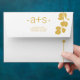 This is a graceful wedding envelope that features a gold line with a branch with leaves and a dot on the right positioned against a white background. Your initials and dots are on the flap. It is part of our “Jewellery inspired gold foil wedding invitation collection” wedding suite.