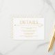 This beautiful wedding enclosure card has a sophisticated design with a gold line of concentric circles and a leaf on the right side and a dot on the left side on a white background. For an extra touch of elegance, the couple's names are featured in gold diagonal pattern on the backside of the card. It is possible to customize the card by adjusting the size of the text to fit the desired amount of space.