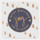 Elegant pine trees pattern and a hanging metallic gold copper "joy" trendy calligraphy script over a dark midnight navy blue and light grey background with round custom typography script. ++++++++ Personalize it with your text and family name! +++++++++ Suitable as a seal for Christmas winter seasonal holidays or birthday gifts or mailings.