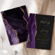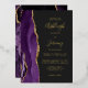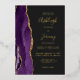 The left-hand edge of this elegant modern wedding invitation features a purple watercolor agate border trimmed with faux gold glitter. The customizable text combines handwriting, copperplate and italic fonts in real gold foil on an off-black background. The reverse side features a matching purple and gold agate design.