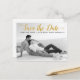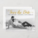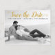 Modern gold script wedding Save the Date photo postcard. This contemporary typography Save the Date design features a black and white photo of the couple and the text "Save the Date" in a modern script font.