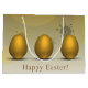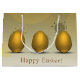 An abstract and modern Easter illustration featuring 3 golden Easter eggs on a bokeh background with abstract flowers.
