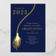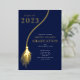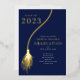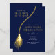 Modern Class of 2022 graduation party invitation featuring a gold tassel and bold lettering set on a blue background. Visit our shop to view this design in a variety of school colors.
