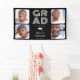 Simple GRAD photo collage graduation banner. Design features 4 square pictures of the grad, decorative lettering, a mortarboard, name, place of study and class year. The black background can be changed to any colour of your choice.