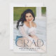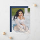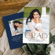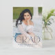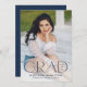 Announce your high school or college graduate's graduation with this modern graduation announcement. The graduation announcement displays "Grad" in trendy navy lettering with the graduation year displayed inside of the letter 'd'. Personalize the front of the announcement with the graduate's vertical senior photo, name, and school. The announcement reverses to feature an additional photo displayed inside of a white square frame with your message shown below.