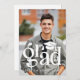 Modern GRAD Type 2 Photos White Overlay Announcement. Announce your graduate's achievement with this photo announcement featuring 2 pictures (one on each side) and a modern typography design for the title GRAD accented with a graduation cap and class year on the front in your choice of text and graphic colours (show in white) and optional information about your graduate on the back. ASSISTANCE: For help with design modification or personalization, colour change, resizing, transferring the design to another product or if you would like coordinating items, contact the designer BEFORE ORDERING via the Zazzle Chat MESSAGE tab or email makeitaboutyoustore@gmail.com.