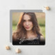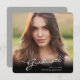 A unique custom square graduation announcement card, featuring design elements of modern text fused with elegant calligraphy script. The graduates photo highlights the front of the card while the back of the card offers personalized text spaces for information about the graduation and future journey. Backgrounds are trendy dark gradient on the front and silver grey on the back or easily customize the back of the card to a colour of your choice. To see more items like this, visit my store here at "www.Zazzle.com/LakeViewCardCo". Thanks