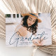 Celebrate the grad with our stylish photo graduation announcement. The graduation announcement displays the graduate's photo with "Graduate" in a navy modern calligraphy script overlay. Personalize the front of the modern graduation announcement by adding the graduate's name, school name, and graduation year. The announcement reverses to feature a trendy navy and white dotted geometric pattern. The design is perfect for both high school and college graduates.