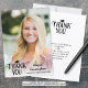 Custom graduation photo thank you cards featuring one photo, THANK YOU accented with a graduation cap, your graduate's name in a modern script and class year graduate and/or school name on the front in your choice of colours for the text and cap on a white ombre photo overlay. The back side offers the option to pre-print your thank you message or delete the sample text to leave the area blank for handwriting notes of appreciation. OPTIONS: The sample is shown in the 4.5x6.25" size; other sizes available. ASSISTANCE: For help with design modification or personalization, colour change, resizing, transferring the design to another product or if you would like coordinating items, contact the designer BEFORE ORDERING via the Zazzle Chat MESSAGE tab or email makeitaboutyoustore@gmail.com.