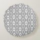 Decorative round pillow with grey damask pattern.