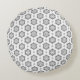 Decorative round pillow with grey damask pattern.