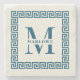 Modern and elegant dusty ocean blue monogram coaster with your custom initial and name within a greek key border frame surrounding in coastal mediterranean colour way.