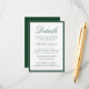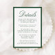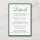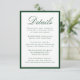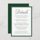 This wedding details card is framed by a rich dark green border and features “Details” in graceful calligraphy, followed by neatly arranged serif text for your guest accommodations and wedding events. The deep green tone creates a sense of depth and refinement, making this design especially fitting for classic, garden, and estate weddings. The combination of strong contrast and elegant typography gives the card a timeless, upscale presentation.
