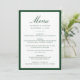 This wedding menu is styled with elegant dark green calligraphy for the “Menu” heading, paired with refined serif lettering for the couple’s information and menu details. A rich green border adds depth and sophistication, making this design especially fitting for estate, garden, and classic wedding settings. The balanced composition offers a polished way to showcase each course with understated elegance.