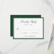 This wedding RSVP card features elegant dark green calligraphy script at the top, paired with classic serif lettering and space for your desired wedding response date. A rich dark green border frames the design, adding depth and structure while maintaining a clean, modern aesthetic. The balanced layout offers a refined way for guests to reply, making this RSVP card ideal for modern classic, formal, and estate-style weddings. Personalize the wording to create a response card that feels cohesive and elevated.