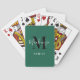 Modern personalized family name playing cards feature a classic custom serif monogram initial in black with your last name / surname in elegant white calligraphy script against a dark emerald green background. Colour scheme can be customized.
