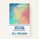 Name badge with a cool and stylish abstract design. Watercolors mix and mingle to create the illusion of a space image. Green with swirls of purple, yellow and light red blend together with a smattering of white dots and stars. A cool trippy creation.