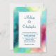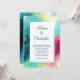 Wedding invitation with a cool and stylish abstract design. Watercolors mix and mingle to create the illusion of a space image. Green with hints of purple, yellow and light red blend together with a smattering of white dots and stars. An elegant artistic creation.