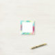 Sticky notes with a cool and stylish abstract design. Watercolors mix and mingle to create the illusion of a space image. Green with swirls of purple, yellow and light red blend together with a smattering of white dots and stars. An elegant artistic creation. A white square layered over top to write inside.