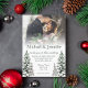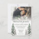elegant modern green script winter wedding photo invitation with snowy pine tree deco.