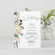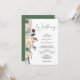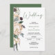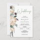 Elegant and modern themed wedding invitation featuring a floral arrangement with white proteas. The calligraphy heading is an image that can be removed. The back of the invitation is a shade of green however the color can be altered. This design is ideal for a modern protea themed wedding and someone wanting to incorporate the color green into their wedding.
