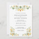 Artistic wedding invitations featuring yellow, orange and teal flowers, vines and leaves across the top and in the two bottom corners, over a white background. Your details are in the middle, in a sans serif. The backside is green and may be changed to any colour that you wish. This design is great for a garden wedding in the summer.