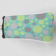 Modern pattern features large and small bubbles of kiwi green and shades of grey on aqua / turquoise background