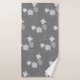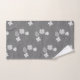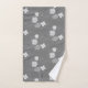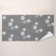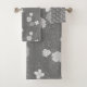 Pretty modern monochrome bath towel set features grey and white flowers with swirls and outlined leaves in silver grey on dark grey background.