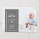 Affordable custom printed baby boy Baptism invitations. This classic design features a modern typography layout next to your child's photo. Keep the neutral grey background or use the design tools to choose any background colour and edit the fonts to suit your style. Personalize the design with your child's Baptism party details. Reverse side has a light grey watercolor stripe pattern or use the space to add additional text and photos. Have fun creating your own unique Christening invitation for your baby boy.