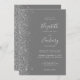The left-hand edge of this elegant modern wedding invitation features a silver faux glitter design. The customizable text combines silver grey handwriting, copperplate and italic fonts on a grey background. The reverse side features a matching grey and silver glitter design.