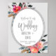 This modern grey winter flower wreath wedding welcome poster is perfect for an elegant wedding. The design features a floral bouquet of coral, pink and peach watercolor peonies on a silver grey background. Customize the poster with the name of the bride and groom, and the date and location of the wedding.