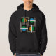 Bold. Minimal. Unexpected. This sleek hoodie features a structured grid of intersecting lines, textured squares, and crisp circles in vibrant blue, green, and orange hues. The design is an abstract dance of geometry and balance — both playful and precise — standing out sharply against the black fabric. Perfect for modern art lovers, design minimalists, or anyone who appreciates clever, wearable symmetry.