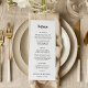 This wedding menu card makes a statement with its modern, bold script. The black and white colour scheme creates a striking and sophisticated look, while the clear layout ensures your guests can easily enjoy the curated courses planned for your special day.