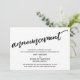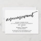 This suite's distinction is due to the modern, handwritten script font used for accent phrases. In the event that you need to let your guests know that your wedding has been cancelled, this card provides a bold, eye-catching option. In this piece, the hand-lettered script font was used to create a graphic simple depicting the word "announcement". Use the template fields to add your personal details and make this unique, modern design your own. The white background can be changed to any colour you prefer. Please reach out with any special requests or for customizing assistance. // 100 //