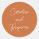 Stylish Modern Handwriting Script Wedding Names Classic Round Sticker in Burnt Orange