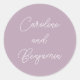 Stylish Modern Handwriting Script Wedding Names Classic Round Sticker in Dusty Lilac