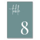 Simple and chic table number cards in dusty teal and white make an elegant statement at your wedding or event. Design features "table" in handwritten script lettering, with the table number at the lower right in timeless serif typography. Design repeats on both sides.