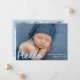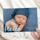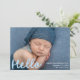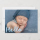 Welcome your little one with this sweet and modern photo birth announcement featuring your baby's horizontal photo and the word "Hello" in a cheerful sky blue handwritten script. Personalize the front with your baby's name, birth date, and birth stats for a heartfelt introduction. The back includes a collage of six square photos with space below to share your family’s names—a charming and stylish choice, perfect for celebrating baby boys.