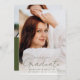 Announce your graduate's achievements and plans with this stylish, modern photo graduation announcement. The front of the announcement displays the graduate's full-bleed vertical photo. "Graduate" is displayed in a trendy, handwritten olive green script. Personalize the announcement with the graduation year, graduate's name, and school name. The announcement reverses to display an additional photo with your custom text below in white lettering with a solid olive green background. This 2 photo graduation announcement is perfect for high school or college graduations.