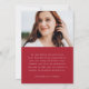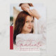 Announce your graduate's achievements and plans with this stylish, modern photo graduation announcement. The front of the announcement displays the graduate's full-bleed vertical photo. "Graduate" is displayed in a trendy, handwritten red script. Personalize the announcement with the graduation year, graduate's name, and school name. The announcement reverses to display an additional photo with your custom text below in white lettering with a solid red background. This 2 photo graduation announcement is perfect for high school or college graduations.